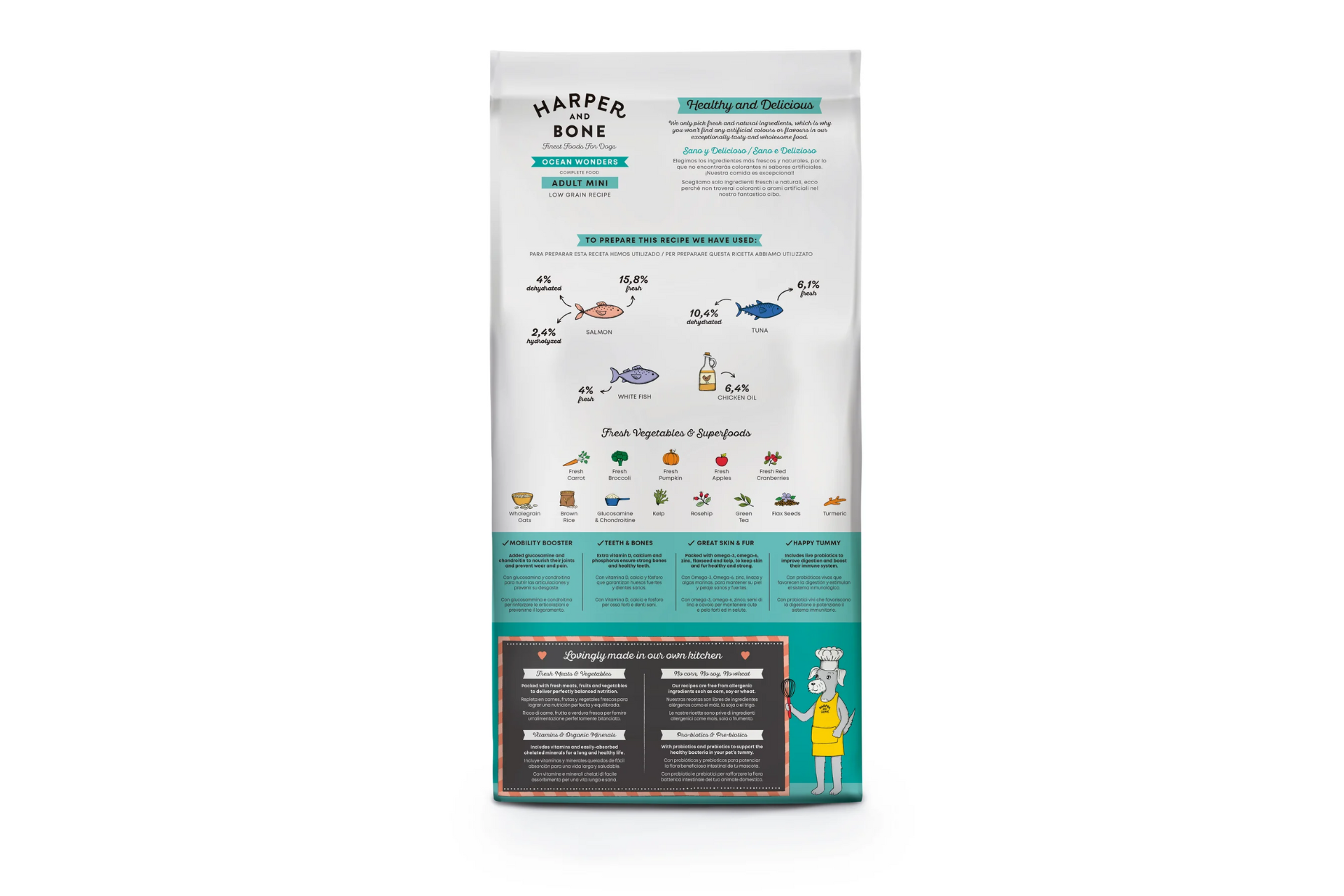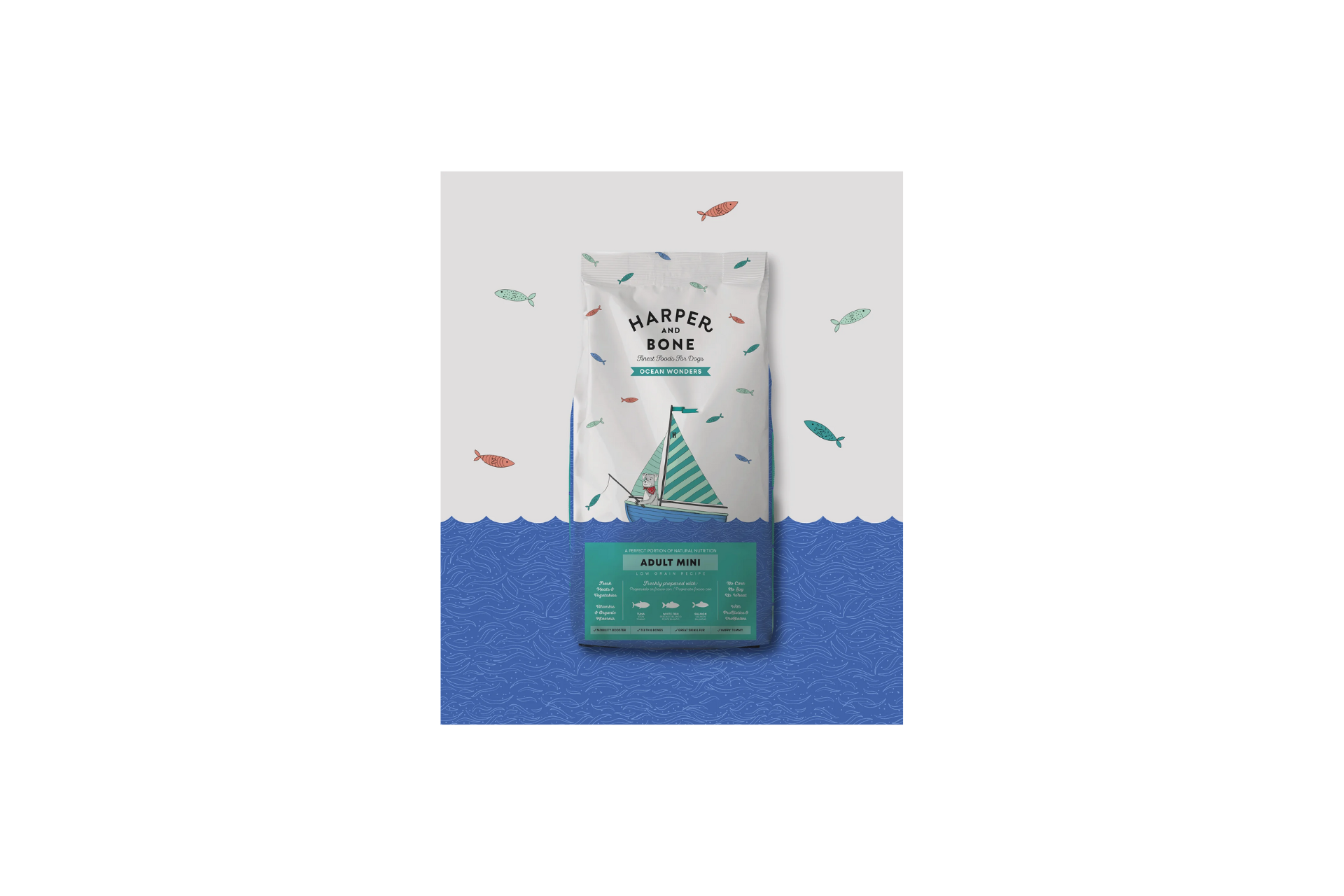 Harper & Bone Ocean Wonders Mini Adult Dog es un pienso seco de alta calidad diseñado específicamente para perros adultos de razas pequeñas. Esta fórmula premium combina proteínas de origen marino, como atún, pescado blanco y salmón, ofreciendo una nutrición equilibrada y deliciosa para tu mascota. Disponible en presentaciones de 2 kg y 10 kg, este alimento es ideal para quienes buscan lo mejor en alimentación natural para sus perros.