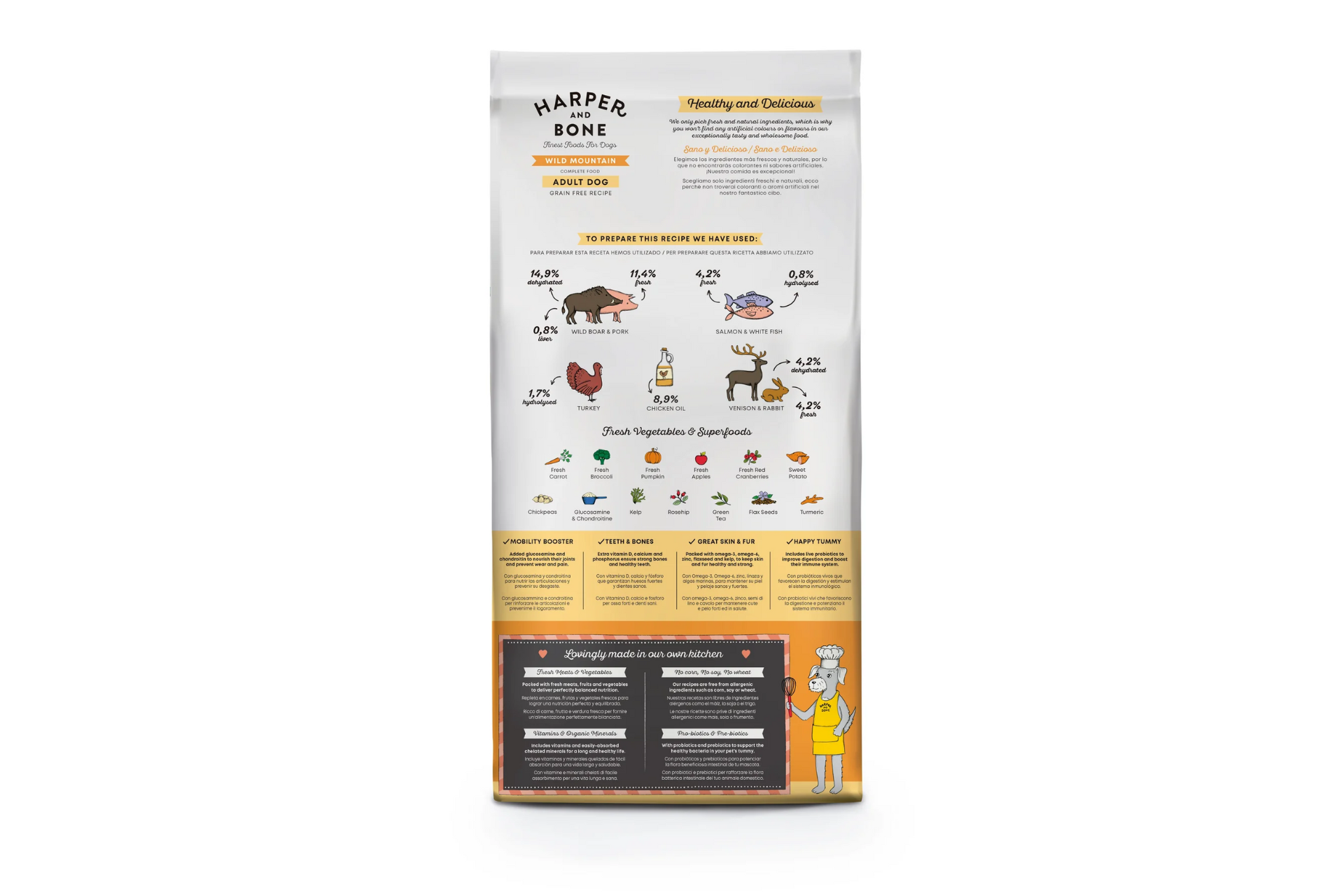Venado fresco (15,8%), jabalí deshidratado (10,4%), cerdo ibérico fresco (6,1%), conejo fresco (4%), aceite de pollo (6,4%), guisantes verdes enteros, patata deshidratada, proteína de guisantes, semillas de lino (0,5%), pulpa de remolacha, fibra de manzana, levaduras (Saccharomyces cerevisiae), aceite de pescado (0,5%), minerales, brócoli fresco, calabaza fresca, zanahorias frescas, manzanas frescas, algas enteras secas, inulina, glucosamina, condroitina, extracto de mandarina, Yucca schidigera, té verde, arándanos rojos enteros, cúrcuma, rosa canina.