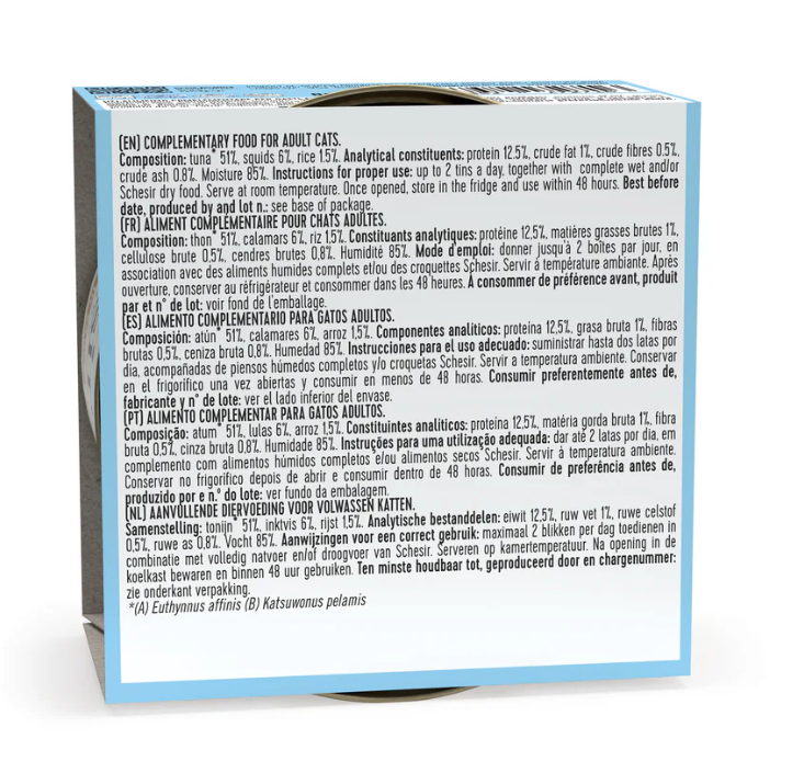 Comida húmeda para gatos de calidad prémium Schesir. Elaborada únicamente con ingredientes frescos, pescados de mar abierto y pollos criados en granjas controladas. Es una receta equilibrada proporcionando un aporte nutritivo completo. La carne y el pescado se cuece y filetea a mano, evitando el uso de colorantes o conservantes. No contiene ningún subproducto animal o vegetal.